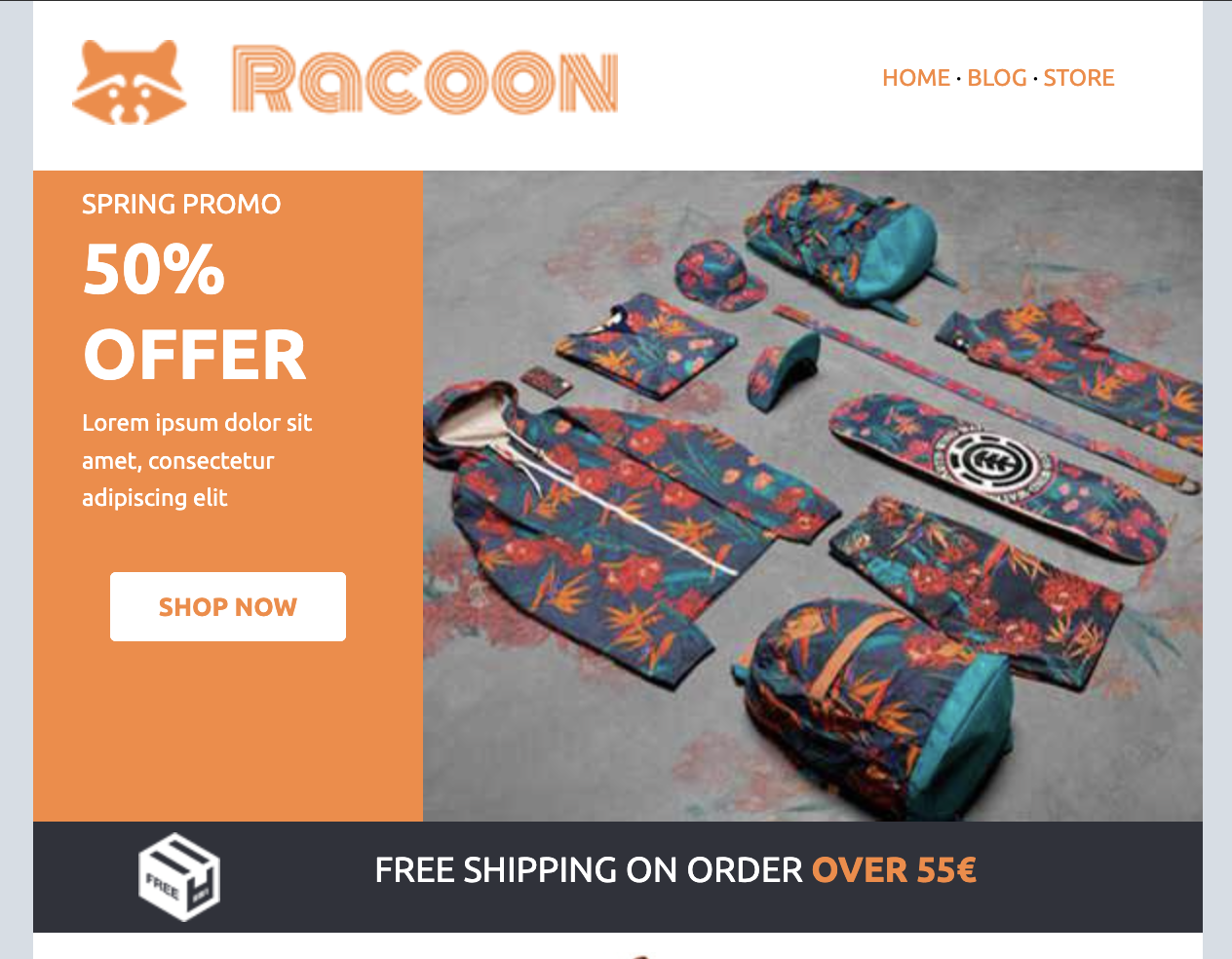 emailSeasonal e-commerce promotion with product grid, featured items, free shipping bar, and icon features section.