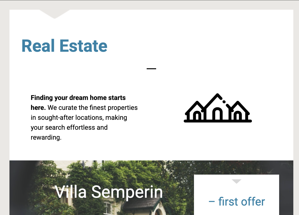 emailProperty listing email with hero imagery, featured property cards with background images, multi-column layout, and decorative sections.